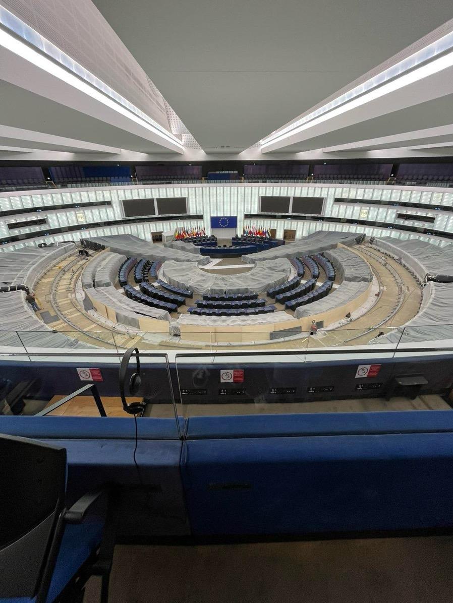 Plenumsalen i Europaparlamentet med sine karakteristiske halvsirkelformede seter, hvor de 705 representantene fra EUs medlemsland samles for debatter og avstemninger.